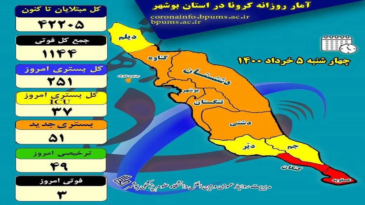 دبیر ستاد مقابله با کرونا در استان بوشهر، درباره نتایج موارد فوتی ناشی از کرونا در استان بوشهر که تا به امروز اعلام شده است، بیان کرد: متاسفانه امروز ۳ فوتی ناشی از ابتلا به کرونا، ۱ آقا با ۸۹ سال سن با سابقه بیماری قلبی و ۲ خانم با ۷۶ و ۷۳ سال سن با سابقه بیماری مغزی، فشارخون و دیابت در استان بوشهر به ثبت رسید