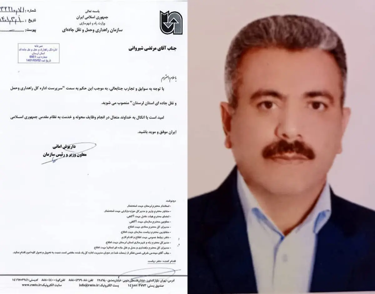 به گزارش رکنا از لرستان، داریوش امانی معاون وزیر راه و شهرسازی و رئیس سازمان راهداری و حمل و نقل جاده ای در این حکم آورده است: با توجه به سوابق و تجارب جنابعالی، به موجب این حکم به سمت سرپرست اداره کل راهداری و حمل و نقل جاده ای استان لرستان منصوب می شوید. امید است با اتکال به خداوند متعال در انجام وظایف محوله و خدمت به نظام مقدس جمهوری اسلامی ایران موفق و موید باشید.