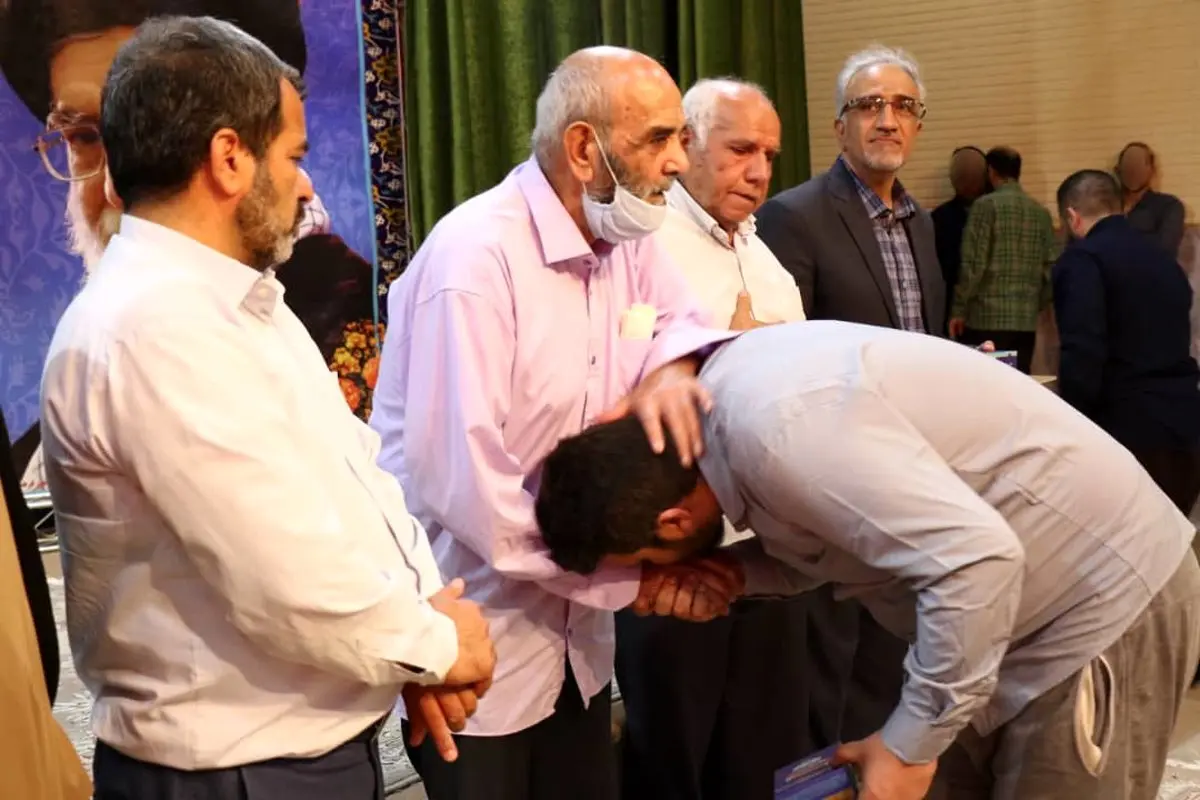 بوسه زندانیان آزاد شده زندان قم بر دستان پدران شهدا