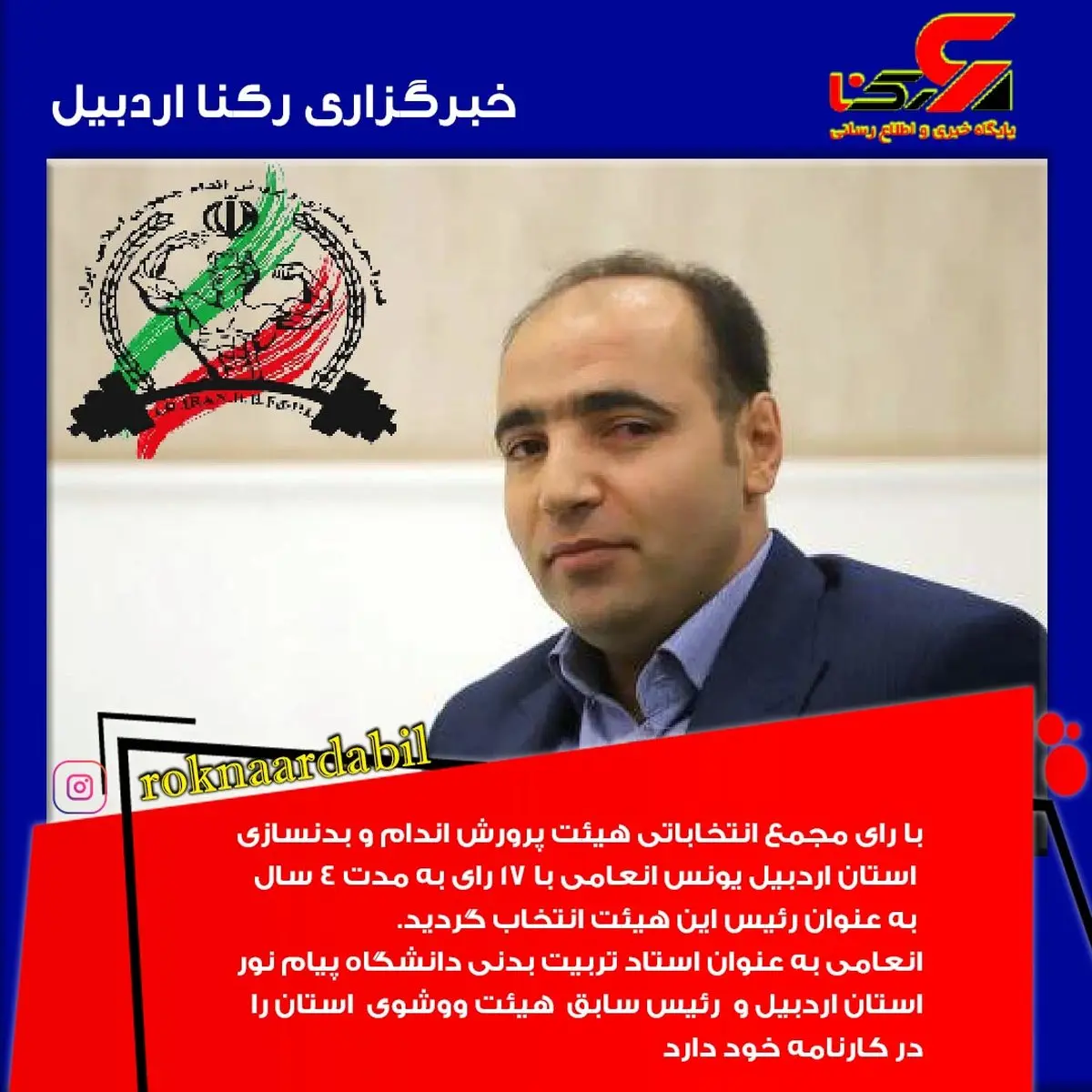 با رای مجمع انتخاباتی هیئت پرورش اندام و بدنسازی استان اردبیل یونس انعامی با 17 رای به مدت 4 سال به عنوان رئیس این هیئت انتخاب گردید.