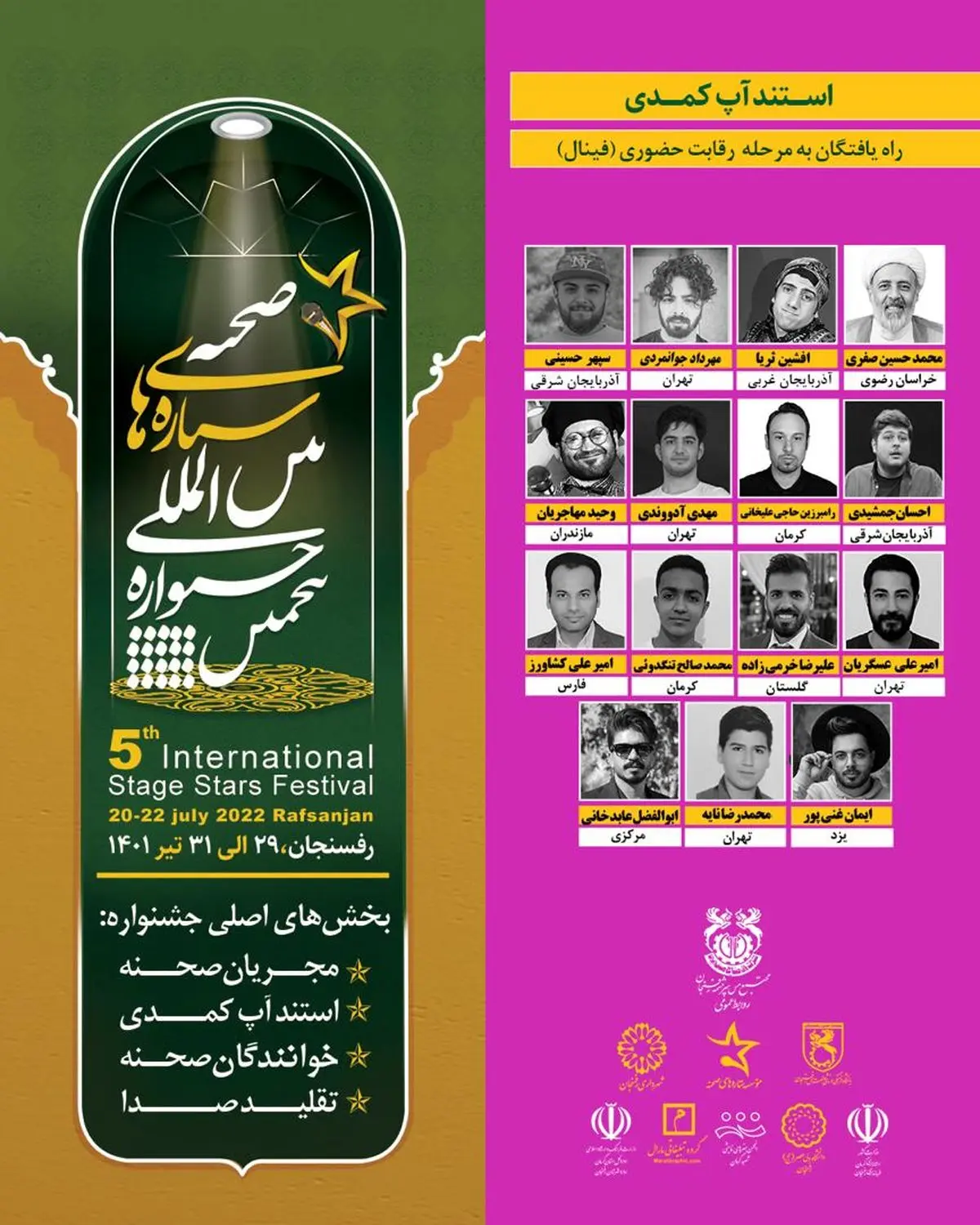 گفتنی است؛شرکت کنندگان در جشنواره بین المللی ستاره های صحنه در بخش های اصلی مجریان صحنه، استندآپ کمدی، خوانندگان صحنه و تقلید صدا از ۲۹ الی ۳۱ تیرماه ۱۴۰۱ در شهرستان رفسنجان استان کرمان با حضور چهره های برتر جهانی و کشوری به رقابت خواهند پرداخت.