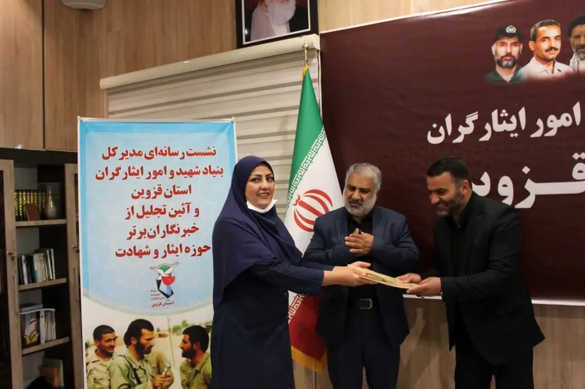 همچنین سرپرست بنیاد شهید و امور ایثارگران استان قزوین و مشاور استاندار و مسئول هماهنگی امور ایثارگران استانداری قزوین با اهدای لوح تقدیر و هدایایی از خبرنگاران جانباز ولیالله حسینزاده و رضا اسدی و همچنین خبرنگاران فعال و برتر حوزه ایثار و شهادت لیلا بیگدلی از خبرگزاری رکنا، نسرین رحیمی از خبرگزاری ایرنا، سهیلا عظیمی از خبرگزاری بسیج، زینب کلهر از خبرگزاری برنا، زهرا محبی از پایگاه ایثار و نوید شاهد، سید حسن حسینی از خبرگزاری حوزه، نسترن کیماسی از خبرگزاری دفاع مقدس، محمدرضا قزوینیمقدم از روزنامه ولایت، ندا حسینپور از خبرگزاری صداوسیما و باشگاه خبرنگاران جوان و طاهره موسوی از پایگاه خبری تیتر قزوین تجلیل کردند.