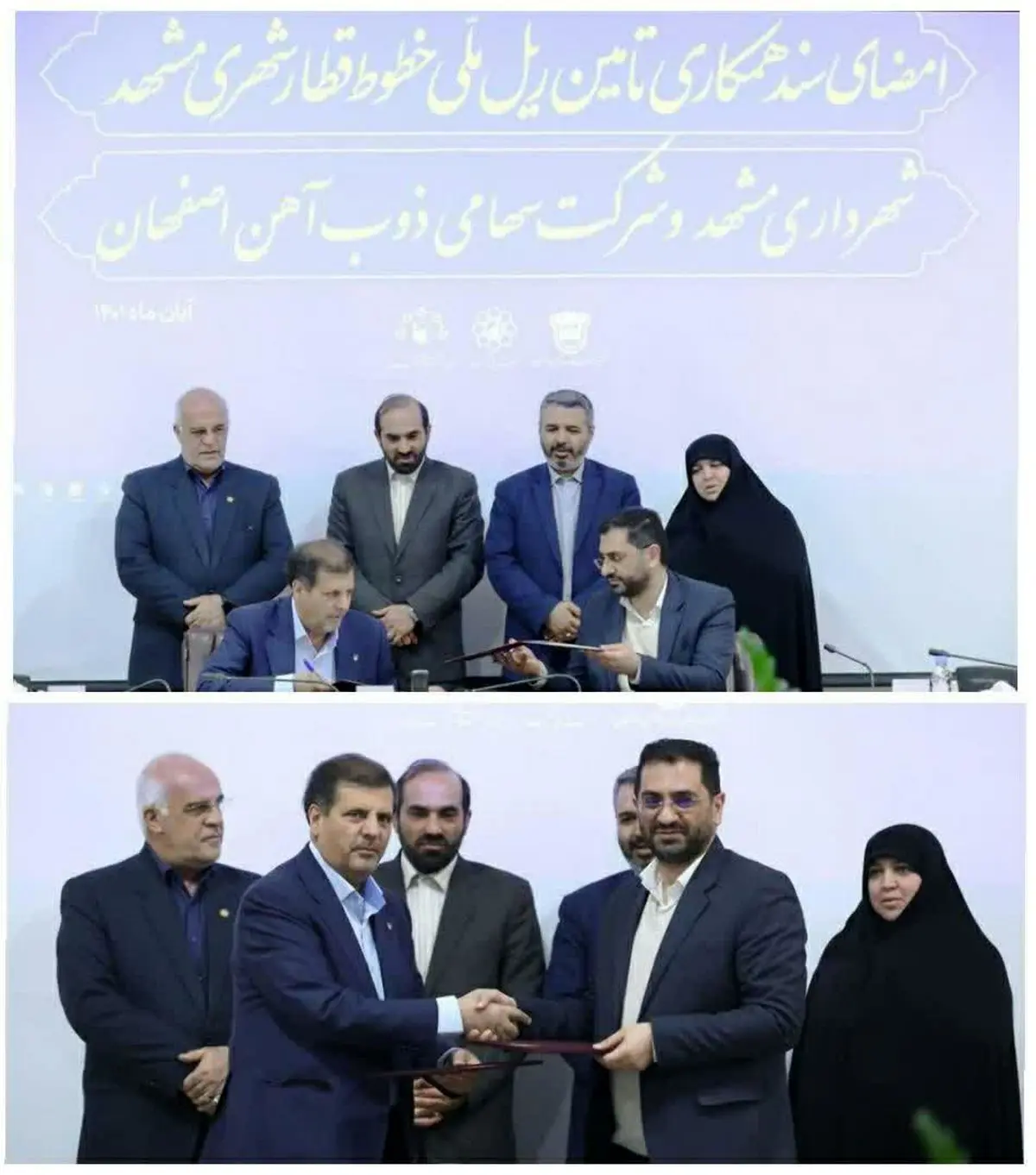 رکنا: سند همکاری تامین ریل ملی خطوط قطار شهری مشهد با حضور مهندس ایرج رخصتی مدیرعامل ذوب آهن اصفهان و سید عبدالله ارجایی شهردار کلان شهر مشهد منعقد شد .