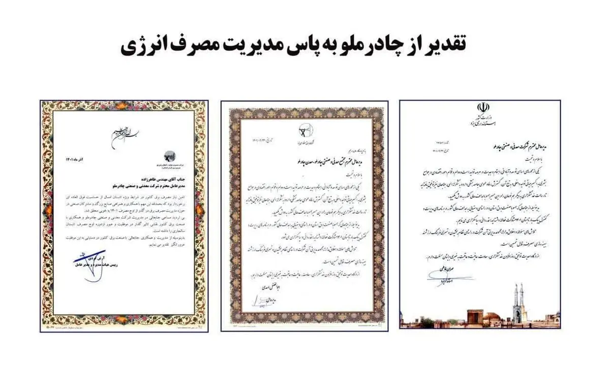 در بخشی از این تقدیر نامه ها آمده است : یکی از محورهای اساسی توسعه و آبادانی کشور ، اهتمام و جدیت در عرصه تولید در جهت دوام و قوام امور اقتصادی و گسترش رفاه عمومی است . بدینوسیله از مدیریت عامل شرکت معدنی و صنعتی چادرملو که همسو با صنعت برق کشور و استان در مدیریت و کنترل پیک مصرف تابستان سالجاری فعالانه مشارکت داشته اید قدردانی می کنیم .