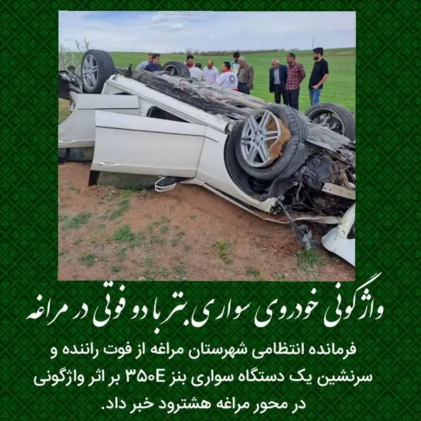 این مقام انتظامی افزود: در بررسی های اولیه مشخص شد سواری بنز 350E دچار واژگونی شده که راننده و سرنشین آن به علت شدت جراحات وارده در بیمارستان فوت شده است.