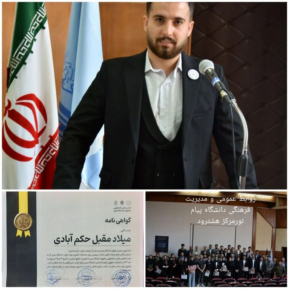 رکنا:میلاد مقبل حکم آبادی دانشجوی دانشگاه پیام نور مرکز هشتروددر این دور از مسابقات، موفق به اخذ گواهینامه موت کورت ملی شد.