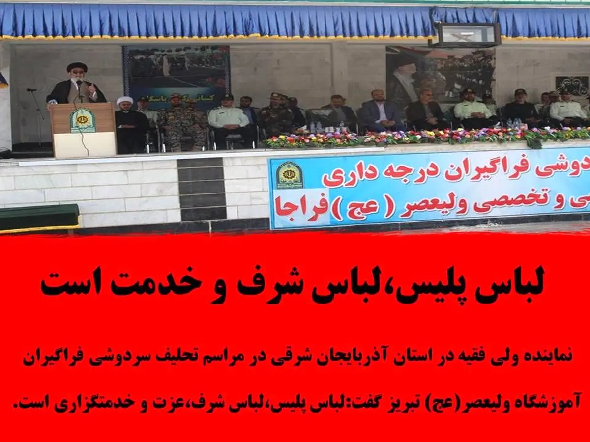 رکنا:نماینده ولی فقیه در استان آذربایجان شرقی در مراسم تحلیف سردوشی فراگیران آموزشگاه ولیعصر(عج) تبریز گفت:لباس پلیس،لباس شرف،عزت و خدمتگزاری است.