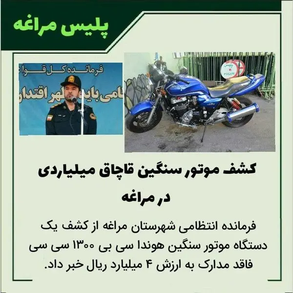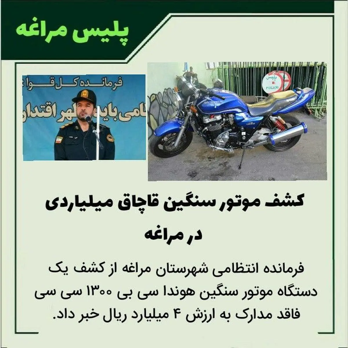 رکنا:فرمانده انتظامی شهرستان مراغه از کشف یک دستگاه موتور سنگین هوندا سی بی ۱۳۰۰ سی سی فاقد مدارک به ارزش ۴ میلیارد ریال خبر داد.
