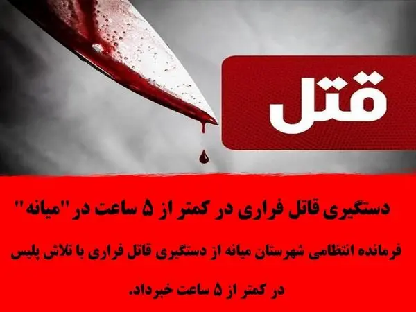 رکنا:فرمانده انتظامی شهرستان میانه از دستگیری قاتل فراری با تلاش پلیس در کمتر از 5 ساعت خبرداد.