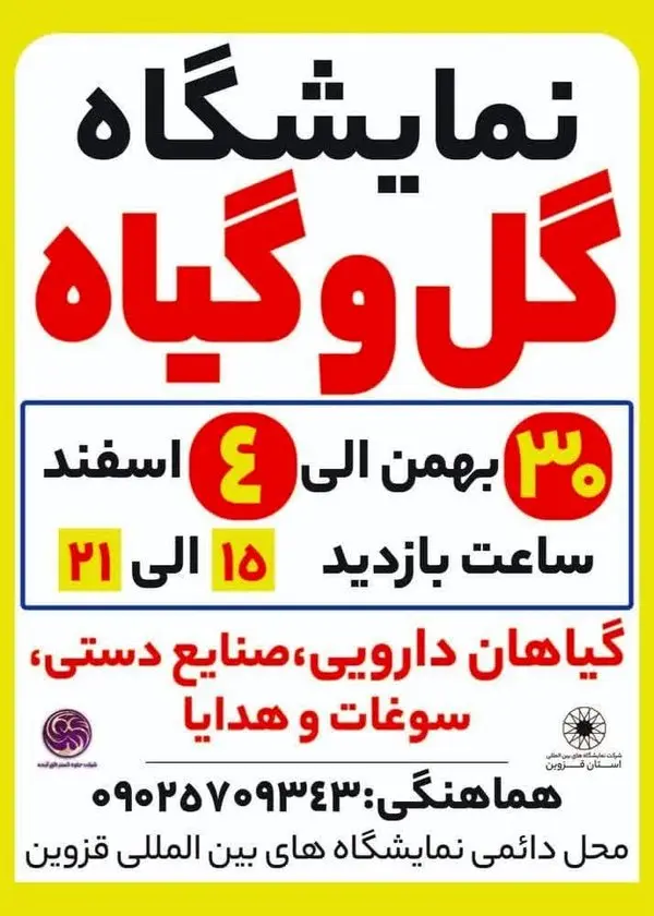 نمایشگاه گل و گیاه تا ۴ اسفند ماه به مدت پنج روز از ساعت ۱۵ الی ۲۱ در محل نمایشگاه بین المللی استان قزوین آماده بازدید علاقه مندان است.