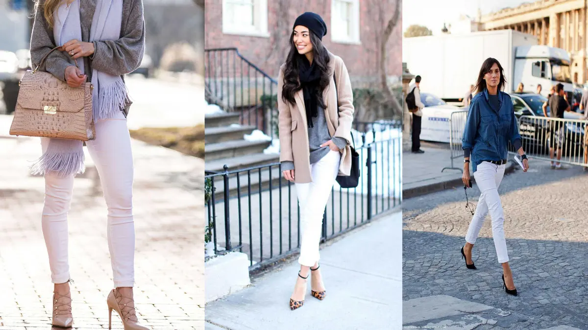 بهتر است در نیمه سرد سال جین سفید را با بلوز یا پالتو سفید نپوشید و از رنگهای متضاد و گرمتر استفاده کنید تا ظاهرتان یکنواخت و ساده به نظر نیاید. کرم و بژ همراه با کیف و کفش قهوهای ظاهرتان را شیک و منحصر به فرد میکند. کیف و کفش مشکی و طیف رنگی قهوهای از سوخته را روشن و عسلی؛ بهترین رنگ برای ست شدن با شلوار جین سفید است.
