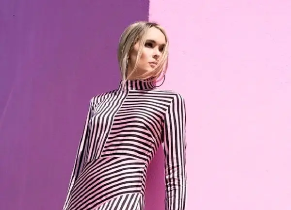لباسی بلند با راه راه های بسیار پهن مورب صورتی و قرمز است که چنانچه با کفش های سگک دار هم رنگ ، موهای صاف ، رژلب صورتی کمرنگ و گوشواره های حلقه ای بزرگ ، ترکیب شوند استایلی مشابه اواخر دهه شصت و اوایل دهه هفتاد را القاء می کنند. این لباس مناسب موقعیت های غیر رسمی و دوستانه است.