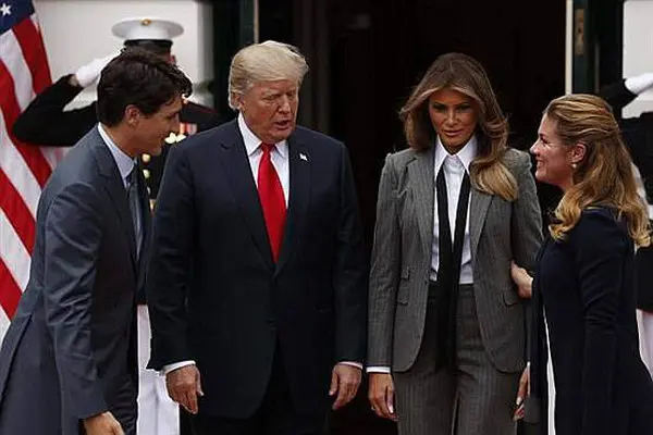 در جریان نشستی که دونالد ترامپ و ملانیا ترامپ، میزبان جاستین ترودو و همسرش، سوفی در کاخ سفید بودند، ملانیا یک کت و شلوار راه راه خاکستری پوشیده و یک کراوات گره نزده به دور گردنش انداخته بود.