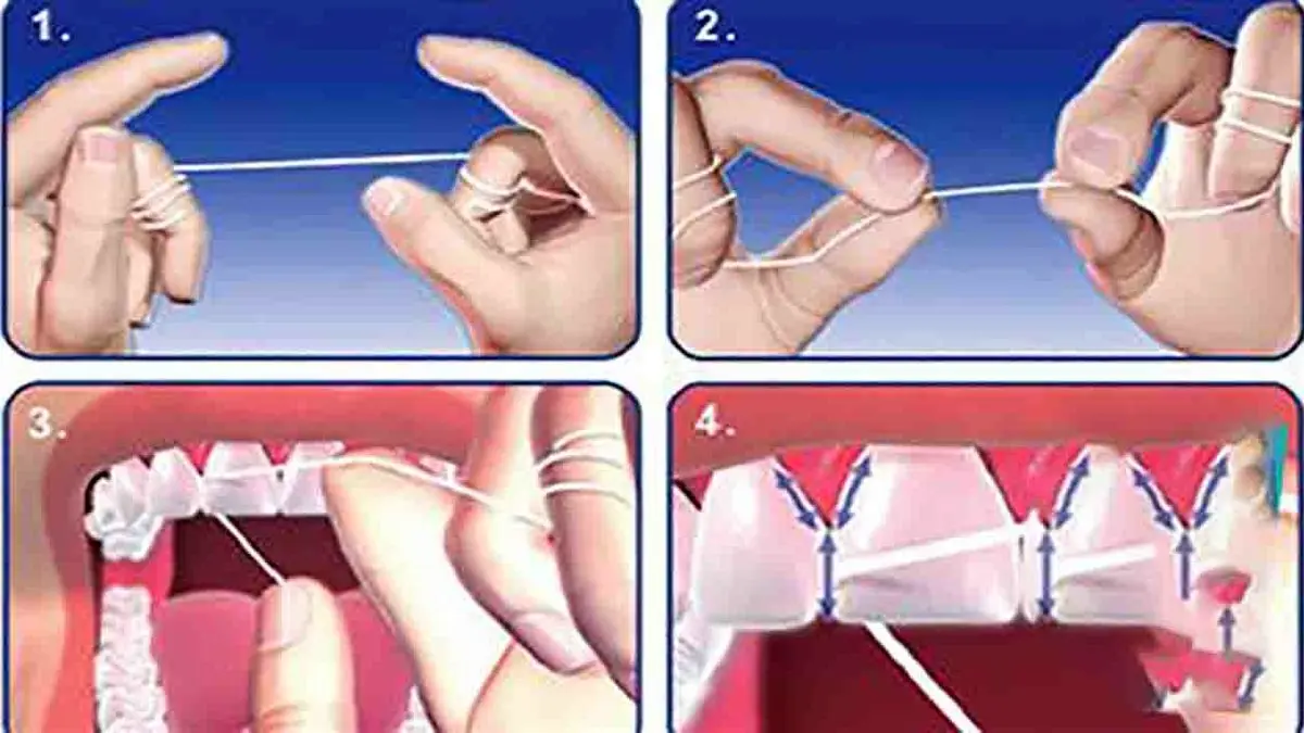 حدود 50 سانتیمتر از نخ را دور انگشتان وسط هر دست بپیچید. نخ را بین دو انگشت شست و اشاره به گونهای بگیرید که دو و نیم تا پنج سانتیمتر از نخ بین دو انگشت کشیده شود. نخ را با انگشت شست بین دندانهای بالا برانید.