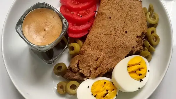 دو عدد سفیده تخم مرغ را با آرد، تخم کتان و کمی آب و بیکینگ پودر ترکیب کرده و نان درست کنید. در ماهیتابه داغ نچسب بدون روغن+ یک تخم مرغ کامل آبپز +زیتون +گوجه +اسپرسو