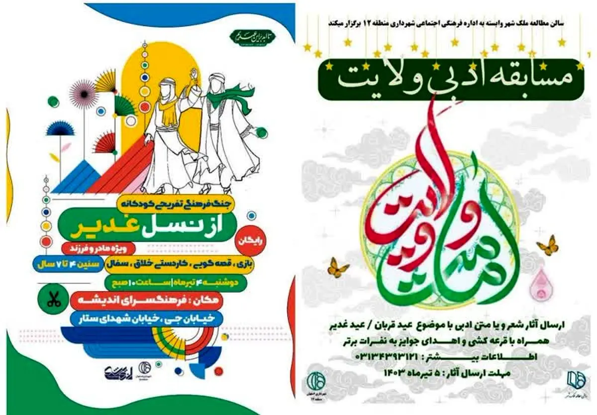در این ایام، مسابقه ادبی «سرور ولایت» نیز در قالب مسابقه شعر و متن ادبی با موضوع عید قربان و عید غدیر به همت شهرداری منطقه 12 برگزار می شود. علاقه مندان به شرکت در این رویداد میتوانند آثار خود را در ایتا به آدرس isfahan77@ ارسال کنند. فرصت نهایی شرکت در این مسابقه 5 تیرماه است.