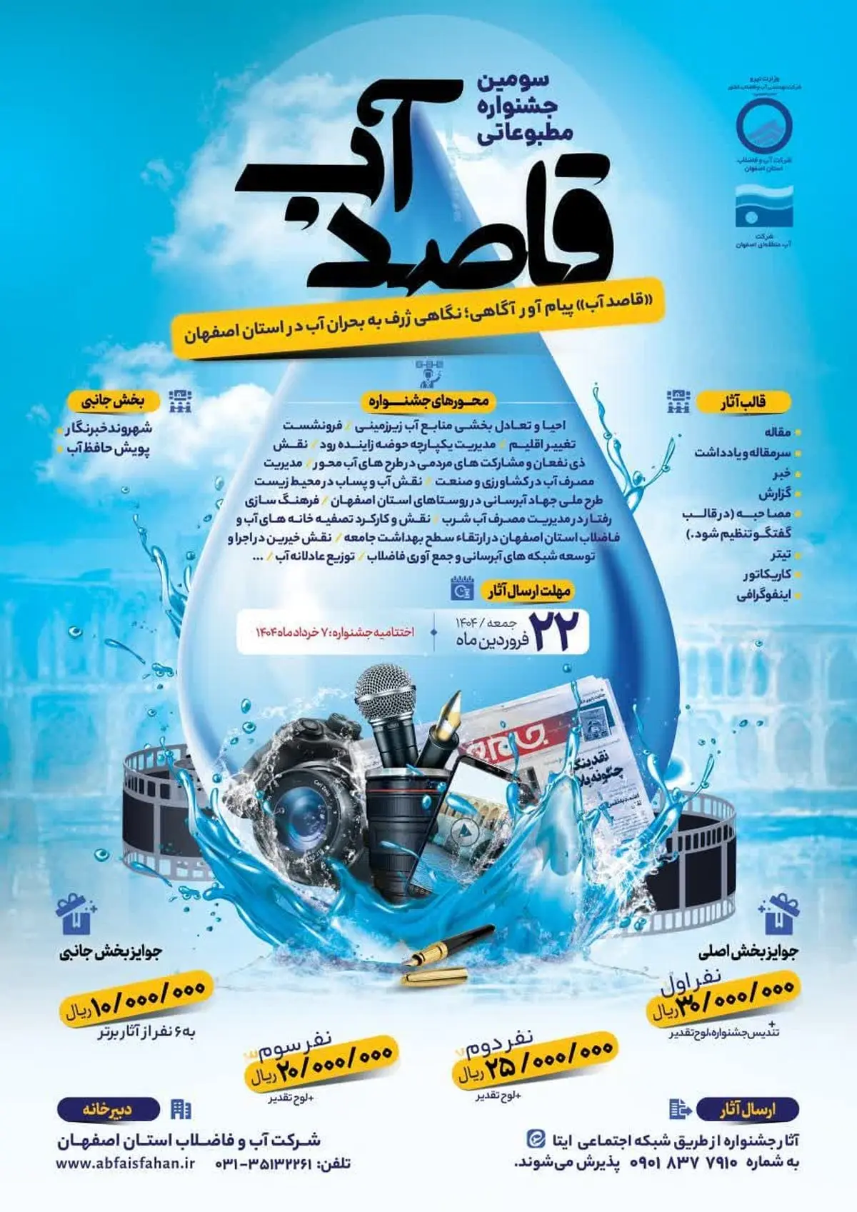 به گزارش رکنا از اصفهان؛ این جشنواره به همت شرکت آبفا استان اصفهان برگزار میشود و علاقه مندان میتوانند آثار منتشر شده در رسانهها را که از تاریخ اول بهمن ۱۴۰۲ تا پایان سال ۱۴۰۳ منتشر شده به دبیرخانه جشنواره ارسال کنند.