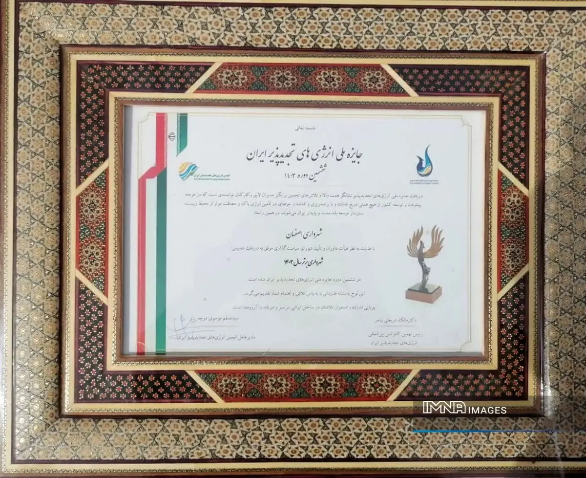 جایزه ملی انرژیهای تجدیدپذیر به شهرداری اصفهان رسید