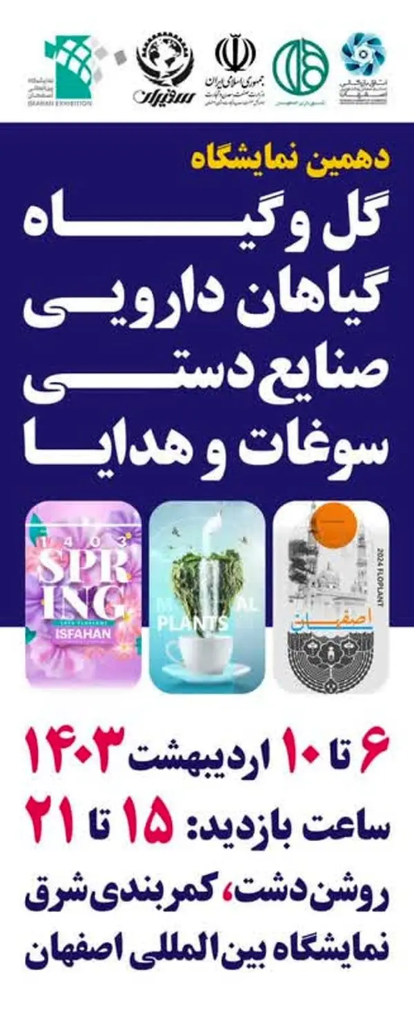 گفتنیاست، نمایشگاه گل و گیاه، گیاهان دارویی، صنایع دستی، سوغات و هدایا 6 تا 10 اردیبهشت ماه 1403 از 15 تا 21 در نمایشگاه های بین المللی استان اصفهان واقع در کمربندی شرق برگزار میشود.