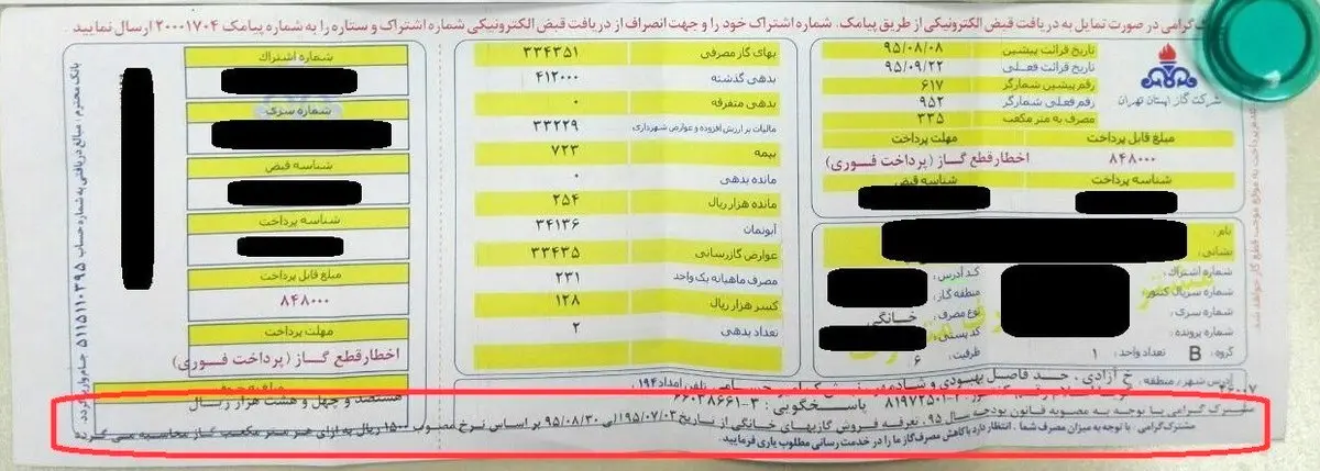 زیر قبوض گاز آخرین دوره فصل گرم امسال عبارت "مشترک گرامی با توجه به مصوبه قانون Law بودجه 95، تعرفه فروش گازبهای خانگی از تاریخ  95.07.03 الی 95.08.30 بر اساس نرخ مصوب 1500 ریال به ازای هر مترمکعب گاز محاسبه می گردد." درج شده بود.