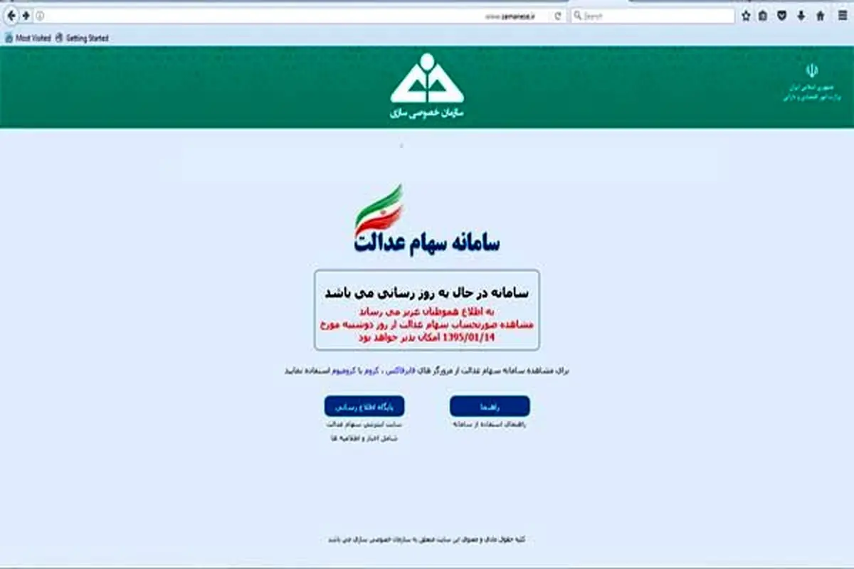 رکنا اقتصادی: سامانه سهام عدالت که از ۳۰ اسفند ۹۵ برای بروزرسانی صورتحساب مشمولان از دسترس خارج شده بود، از روز دوشنبه ۱۴ فروردین برای مشاهده صورتحساب سهام عدالت در دسترس خواهد بود.
