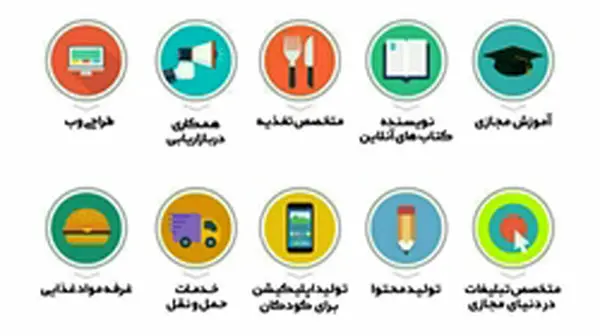 این مشاغل شامل؛ آموزش مجازی،نویسنده کتابهای آنلاین،متخصص تغذیه،همکاری در بازاریابی، طراحی وب، متخصص تیلیغات در دنیای مجازی، تولید محتوا،تولید اپلیکیشن برای کودکان، خدمات حمل و نقل، غرفه موادغذایی، آموزش نرم افزار، تامین و نظارت برمنابع انسانی،ترجمه، آزادکار(Freelancer) و تعمیر گوشی های هوشمند است.برای ورود به کانال تلگرام ما کلیک کنید.