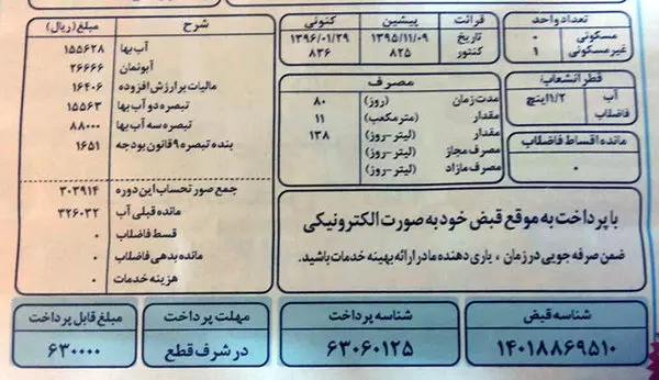 گفتنی است، تعرفههایی آب و کارمزد دفع فاضلاب در سال 1396 هیچگونه افزایشی نداشته است.برای ورود به کانال تلگرام ما کلیک کنید.