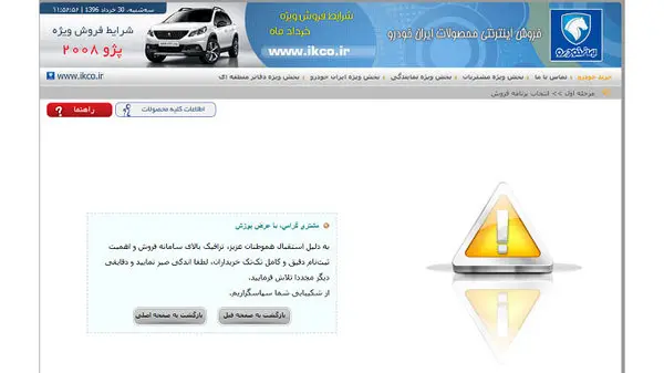 گفتنی است این مشکل در مواقعی که تعداد مراجعه کنندگان به سایت زیاد می شود اتفاق می افتد و در حال حاضر نیز در سایت ایران خودرو با این عبارت مواجه می شویم: