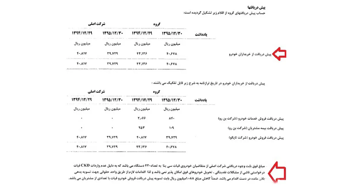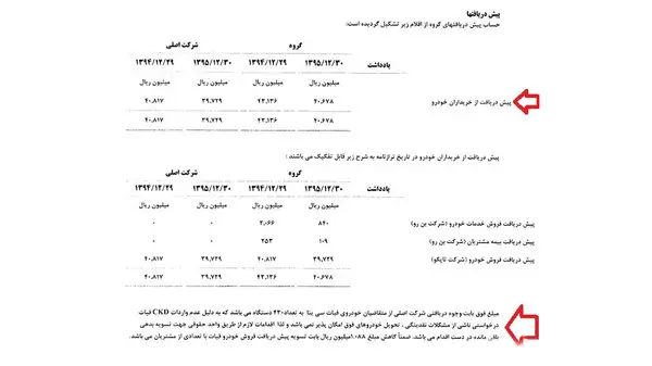 نکته قابل تامل و عجیب آن است که علت عدم واردات CKD خودروی فیات سی نا توسط این شرکت وابسته به سایپا، "مشکلات ناشی از نقدینگی" بوده است و در حالی که مانده طلب متقاضیان پیش خرید، در پایان سال 94، مبلغ 40 میلیارد و 817 میلیون ریال بوده، فقط 1 میلیارد و 88 میلیون ریال آن طی سال 1395، تسویه شده است.