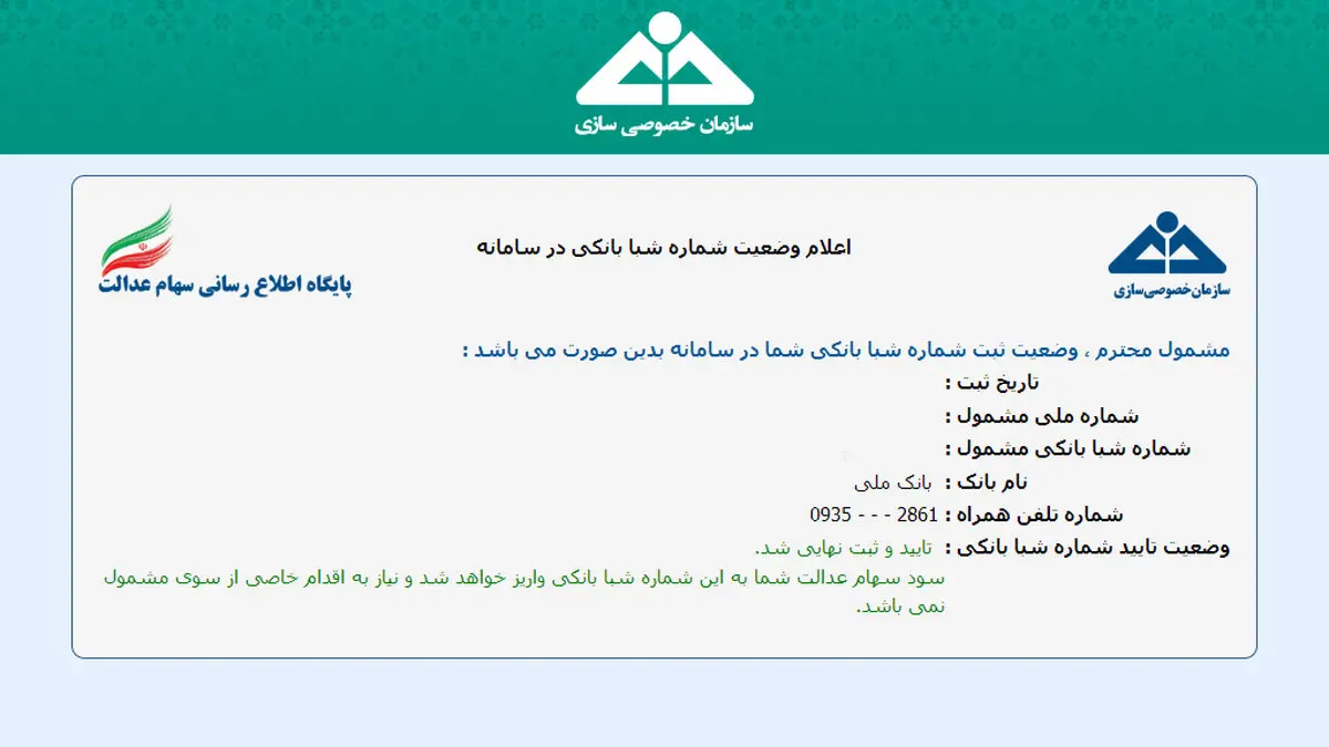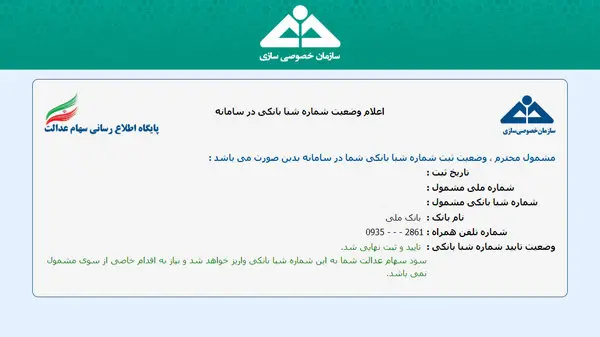 پس از پیگیری مکرر از سوی سازمان خصوصی سازی، با ارسال نامهای توسط بانک مرکزی به کلیه بانکهای عامل و موسسات اعتباری کشور، فرآیند شمارههای شبای بانکی مشمولان سهام عدالت که مدتی متوقف شده بود، دوباره آغاز شد.