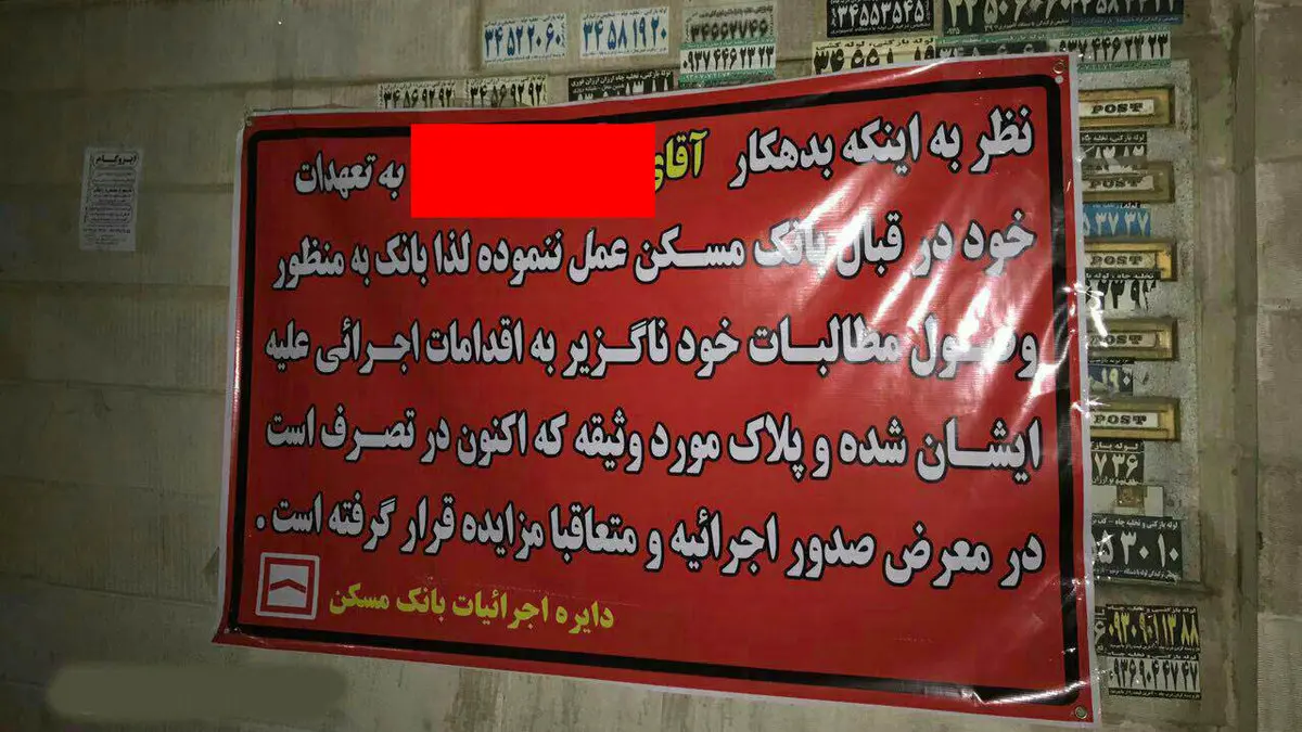رکنا: در این بنر که روی آپارتمان شخصی که نتوانسته بدهی خود را به بانک بدهد نوشته شده: نظر به اینکه بدهکار آقای _ به تعهدات خود در قبال بانک مسکن عمل ننموده لذا بانک به منظور وصول مطالبات خود ناگزیر به اقدامات اجرایی علیه ایشان شده و در پلاک مورد وثیقه که اکنون در تصرف است در معرض صدور اجرائیه و متعاقبا مزایده قرار گرفته است.