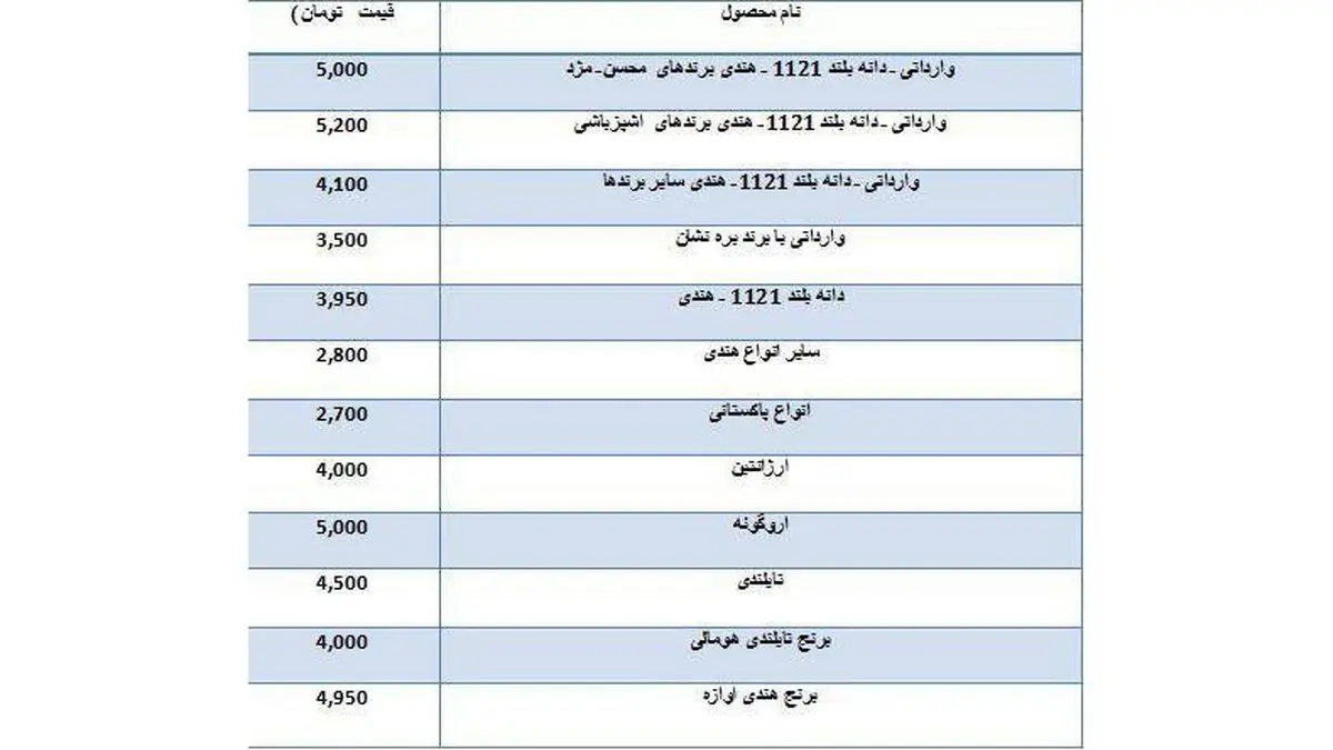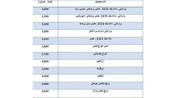 رکنا: نرخ فروش انواع برنج وارداتی به شرح جدول است.