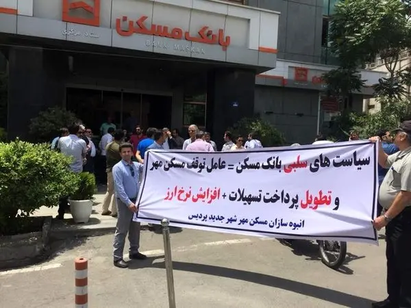 شماری از انبوه سازان مسکن مهر پردیس برای پیگیری مطالبات بانکی خود در محل ساختمان مرکزی بانک مسکن در تهران تجمع کردند.