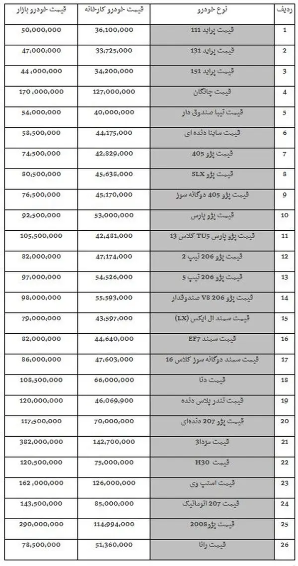امروز پراید 111 با 2 میلیون و 500 هزار تومانی با قیمت 50 میلیون تومان، پژو 206 تیپ 2 با افزایش 1 میلیون تومانی با قیمت 82 میلیون تومان، پژو 206 تیپ 5 با افزایش 3 میلیون تومانی با قیمت 97 میلیون تومان، پژو405 با قیمت 74میلیون و 500 هزار تومان، استپ وی با قیمت 162 میلیون تومان و H30 با افزایش 4 میلیون تومانی با قیمت 120 میلیون تومان مورد معامله قرار میگیرد.