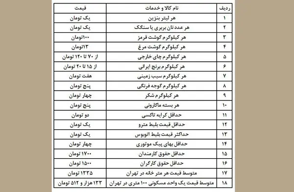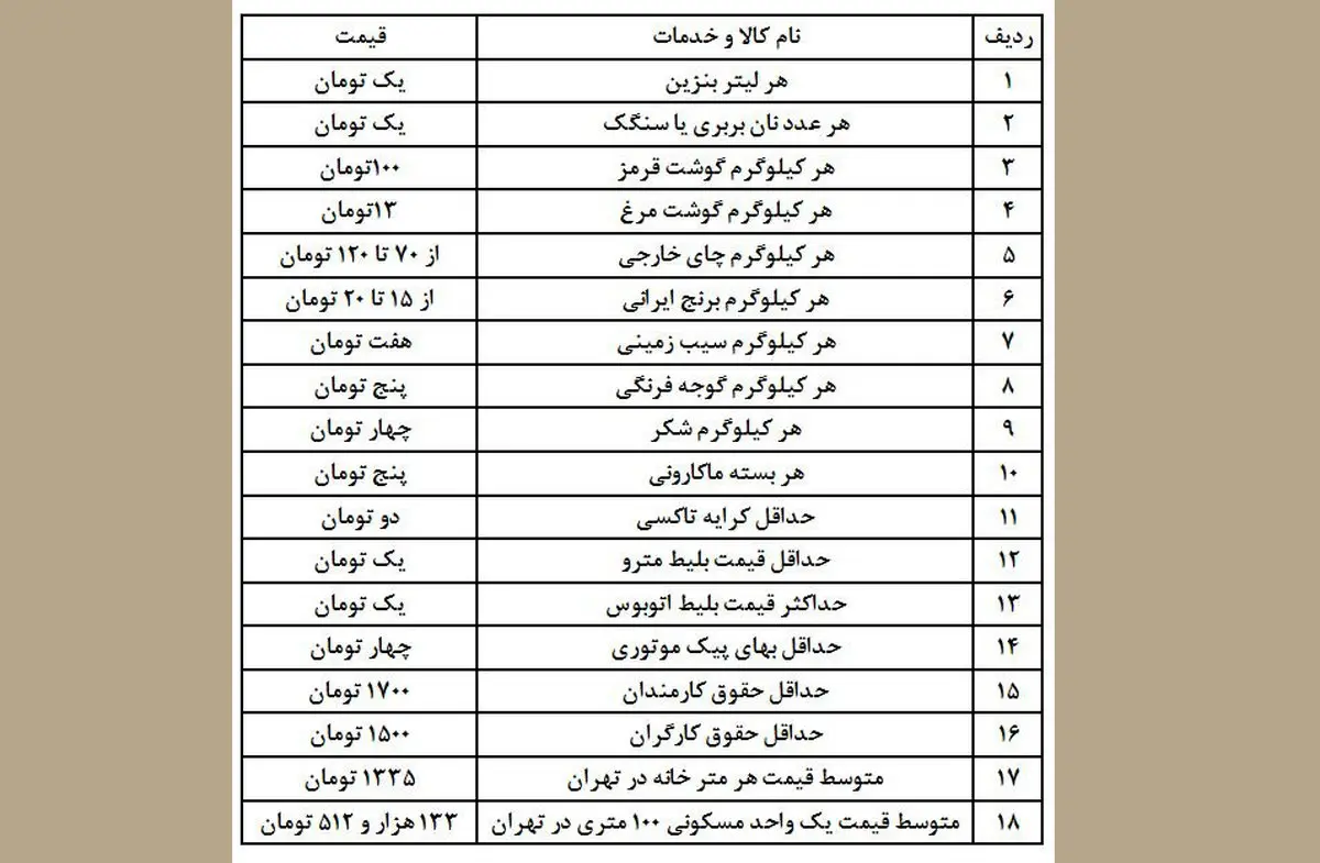 در جدول زیر به صورت فرضی قیمت فعلی برخی کالاها و خدمات اساسی در حالت حذف چهار صفر از پول ملی؛ محاسبه شده است: