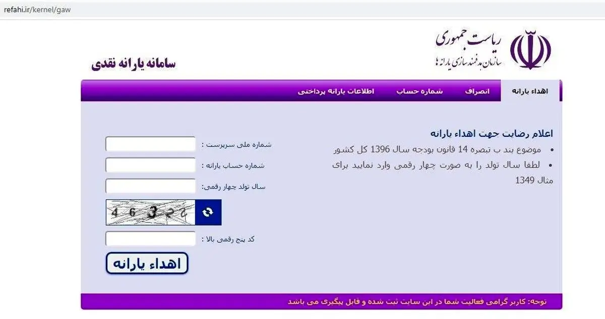 رکنا: تاکید می شود بدنبال اشتباه برخی رسانهها در اعلام سایت refahi.ir برای ثبت نام وام یک میلیون تومانی که بلافاصله سازمان برنامه و بودجه کشور آن را تکذیب کرد، کسانی که از روز گذشته با مراجعه به این سایت سهوا گزینه اهداء یارانه را انتخاب کردند نگران نباشند؛ یارانه این افراد همچنان برقرار و پرداخت می گردد.