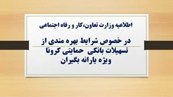 به گزارش رکنا، وزارت تعاون، کار و رفاه اجتماعی در اطلاعیه ای شرایط و ضوابط بهره مندی از تسهیلات بانکی حمایتی کرونا ویژه یارانه بگیران را اعلام کرد.