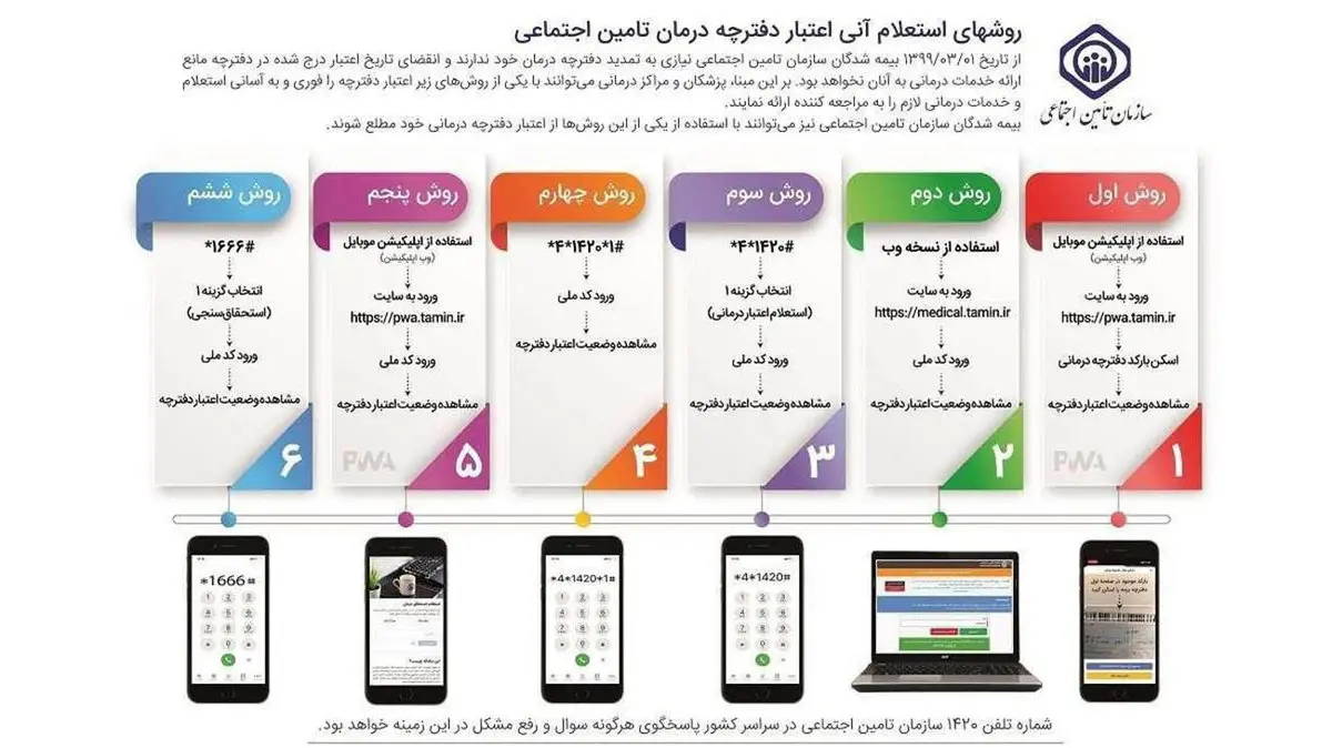 دکتر مصطفی سالاری اظهار کرد: اعتبار دفترچههای درمانی که در اختیار بیمه شدگان این سازمان قرارداد از طریق بارکدخوان با استفاده از دوربین موبایل، شماره گیری USSD کد دستوری #۱*۱۴۲۰*۴* یا #۱۴۲۰*۴*، نرم افزار اپلیکیشن" تامین اجتماعی من" و سامانه ها اینترنتی medical.tamin.ir و pwa.tamin.ir و کد دستوری #۱۶۶۶*بیمه سلامت قابل استعلام است. همچنین در مورد دفترچههای درمانی که در حال حاضر دارای اعتبار است، نیازی به استعلام مجدد اعتبار توسط مرکز خدمت دهنده نیست.