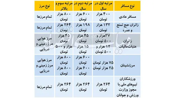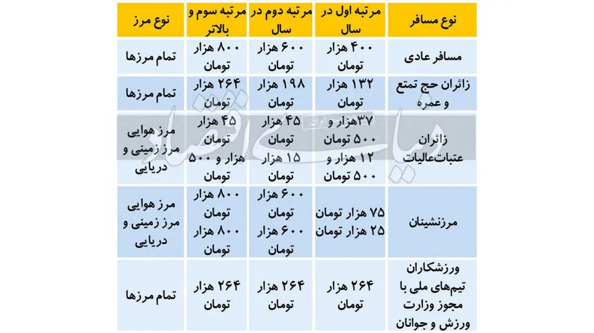 رکنا: براساس اعلام وزارت امور اقتصاد و دارایی و به موجب قانون بودجه امسال کل کشور، عوارض خروج از کشور برای هر مسافر از تمام مرزهای کشور به شرح ذیل اعلام میشود.