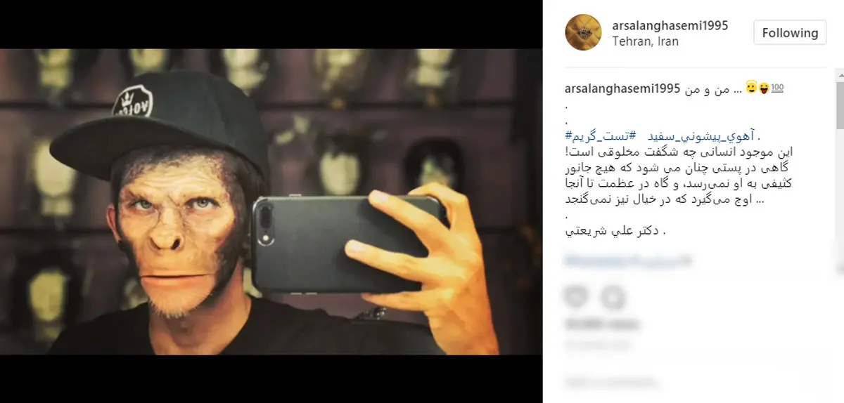 ارسلان قاسمی بازیگر Actor جوان در فیلم سینمایی Movie آهوی پیشونی سفید در نقش یک میمون به ایفای نقش می پردازد.