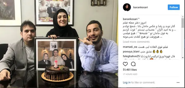 رکنا: باران کوثری با انتشار عکسی در کنار رضا درمیشیان و نوید محمدزاده شمع تولدش را در دفتر مجله فیلم فوت کرد.