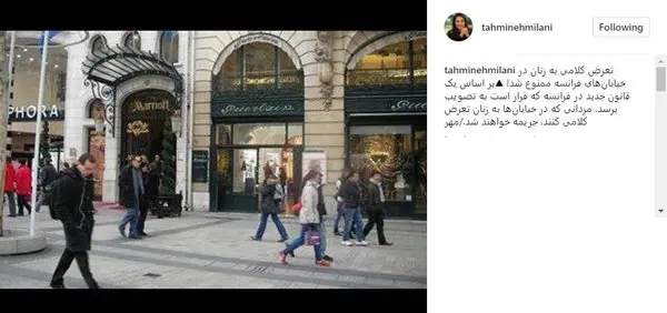 تهمینه میلانی در پی تصویب قانونی جدید در فرانسه برای زنان پستی را در اینستاگرام Instagram منتشر کرد و نوشت: «تعرض کلامی به زنان در خیابان‌های فرانسه ممنوع شد. بر اساس یک قانون Law جدید در فرانسه که قرار است به تصویب برسد، مردانی که در خیابان‌ها به زنان تعرض کلامی کنند، جریمه خواهند شد.»برای ورود به کانال تلگرام ما کلیک کنید.