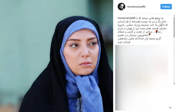حمیرا ریاضی با انتشار این عکس در اینستاگرامش نوشت: یه موقع هایی میشه که با تمام رگ و پی یه دوست،همسایه یا هر انسانی که ناگهان به دلت میشینه رودرک میکنی ...اینروزا دچارش هستم .نقش جدید دور از تهران در تبریز زیبا ... سپاس از محبت و گرمی و صفای حضورتون دوستان بی نظیرم...