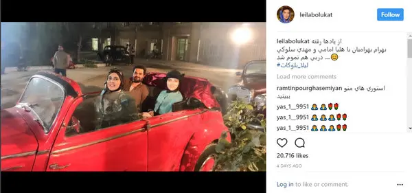 رکنا: لیلا بلوکات عکسی از خودش به همراه بازیگران سریال از یاد رفته ها در یک ماشین کلاسیک قرمز رنگ منتشر کرد.