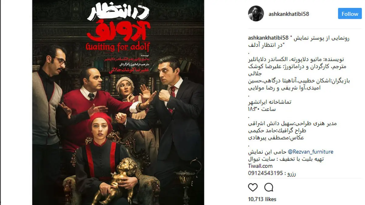 رکنا: اشکان خطیبی با انتشار عکسی در اینستاگرام از تئاتر در انتظار آدولف رونمایی کرد.