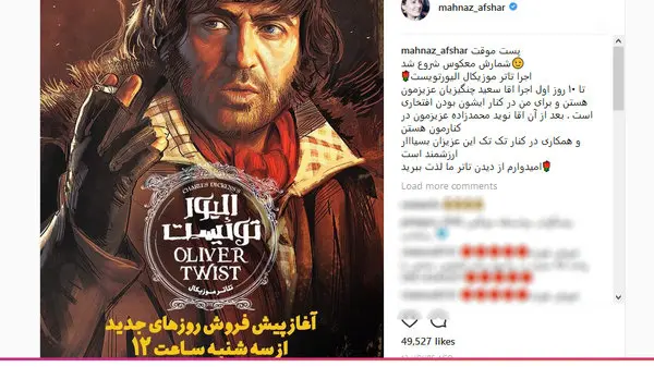 رکنا: مهناز افشار با انتشار پوستر تاتر الیورتویست از پیش فروش و جزئیات آن خبر داد.