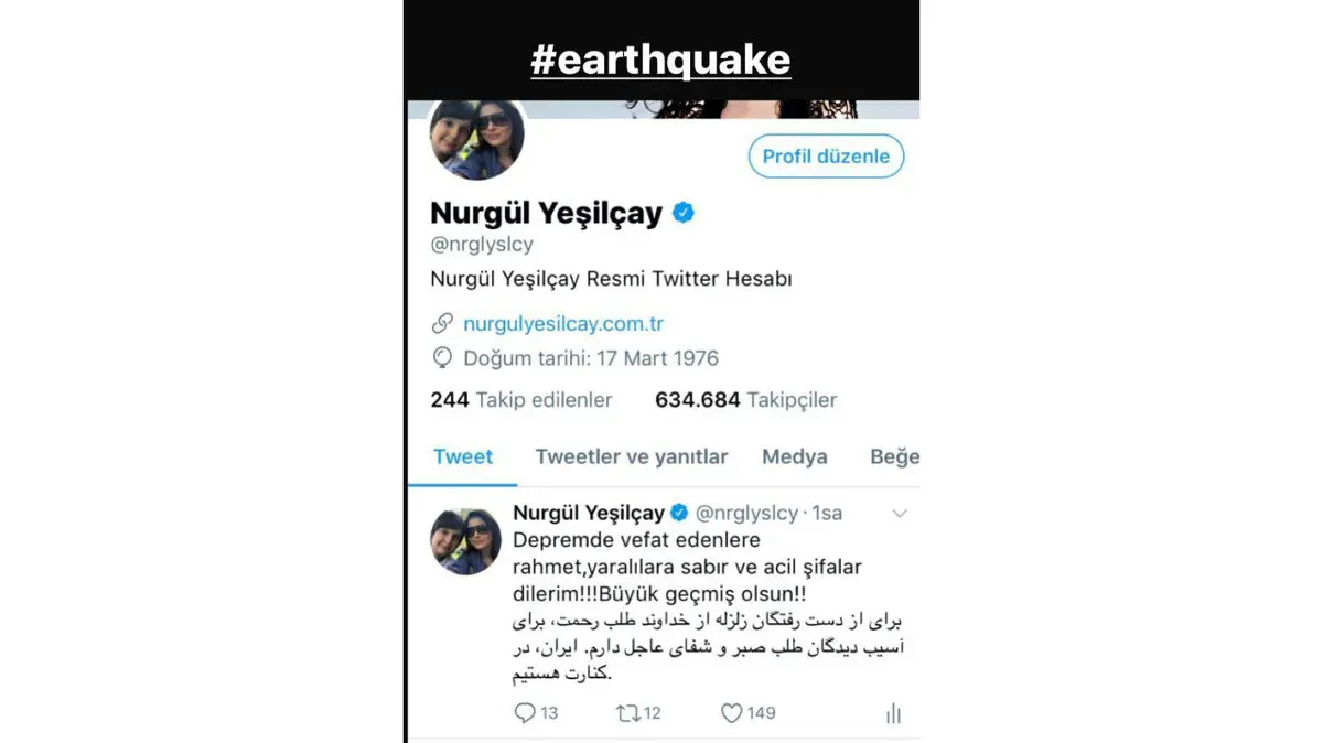 رکنا: یشیل چای بازیگر زن ترکیه ای که به تازگی در فیلم جن زیبا با فرهاد اصلانی همبازی شده بود در استوری اینستاگرام خود به حادثه دیدگان زلزله در ایران تسلیت گفت.