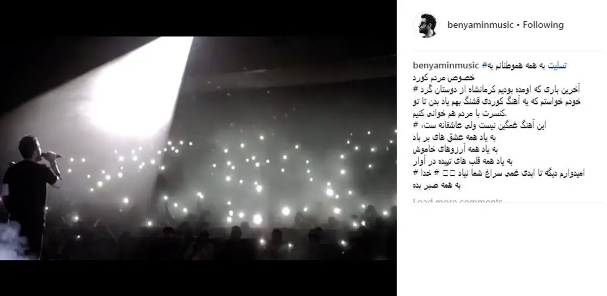"تسلیت به همه هموطنانم به خصوص مردم کورد .آخرین بارى که اومده بودیم کرمانشاه از دوستان کُرد خودم خواستم که یه آهنگ کوردى قشنگ بهم یاد بدن تا تو کنسرت با مردم هم خوانى کنیم.