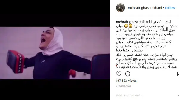 رکنا: مهراب قاسم خانی بعد از اکران مردمی فیلم صفر تا سکو با حضور همسرش و خواهران منصوریان از این فیلم نوشت.