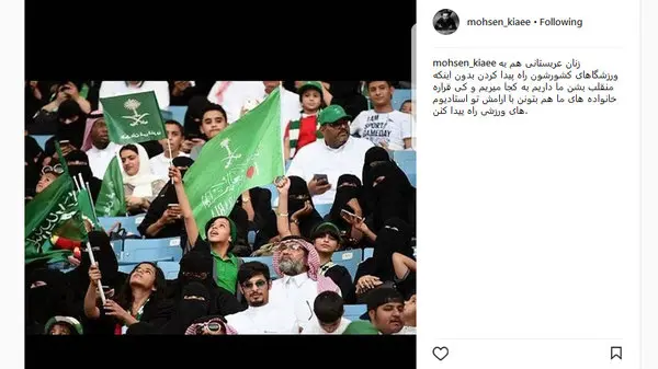 رکنا: محسن کیایی با انتشار عکسی به عدم حضور بانوان در ورزشگاه اعتراض کرد.